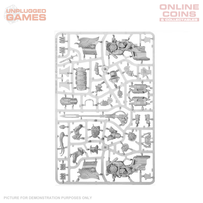 This multi-part plastic kit contains the components necessary to assemble a squad of 3 Vertus Praetors. Astride their Dawneagle jetbikes, they wear somewhat less bulky armour than the other Adeptus Custodes warriors, in order to maintain lightness – while they are still protected by auramite chest plates, shoulder pads and helmets, they wear woven trousers, boots and robes. The armour that they do wear is covered in finely sculpted sigils of the Emperor, with Imperial eagles, lightning bolts, gemstones and filigree adorning every surface, with the jetbikes they pilot featuring similar details on the aggressively-shaped cowling. The Praetors carry interceptor lances and misericordia, while the Dawneagle jetbikes are armed with a choice of hurricane bolters or salvo launcher – whichever you choose, they’re visible at the front of the vehicle, with the engine and weapon feeds visible in gaps in the cowling. The controls feature a large screen, with plenty of dials and buttons. The kit can also make a Shield-Captain, who is distinguished by his bare head.